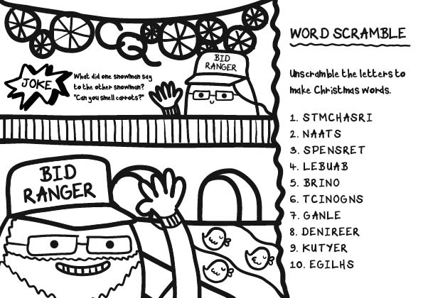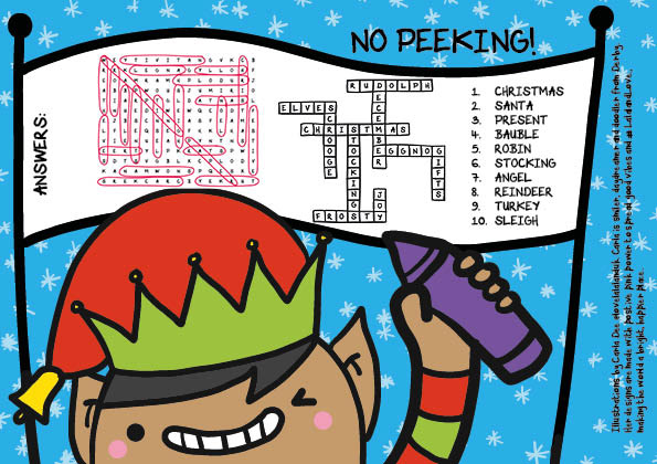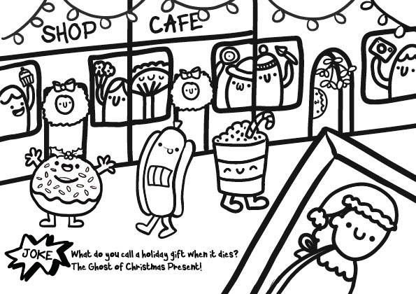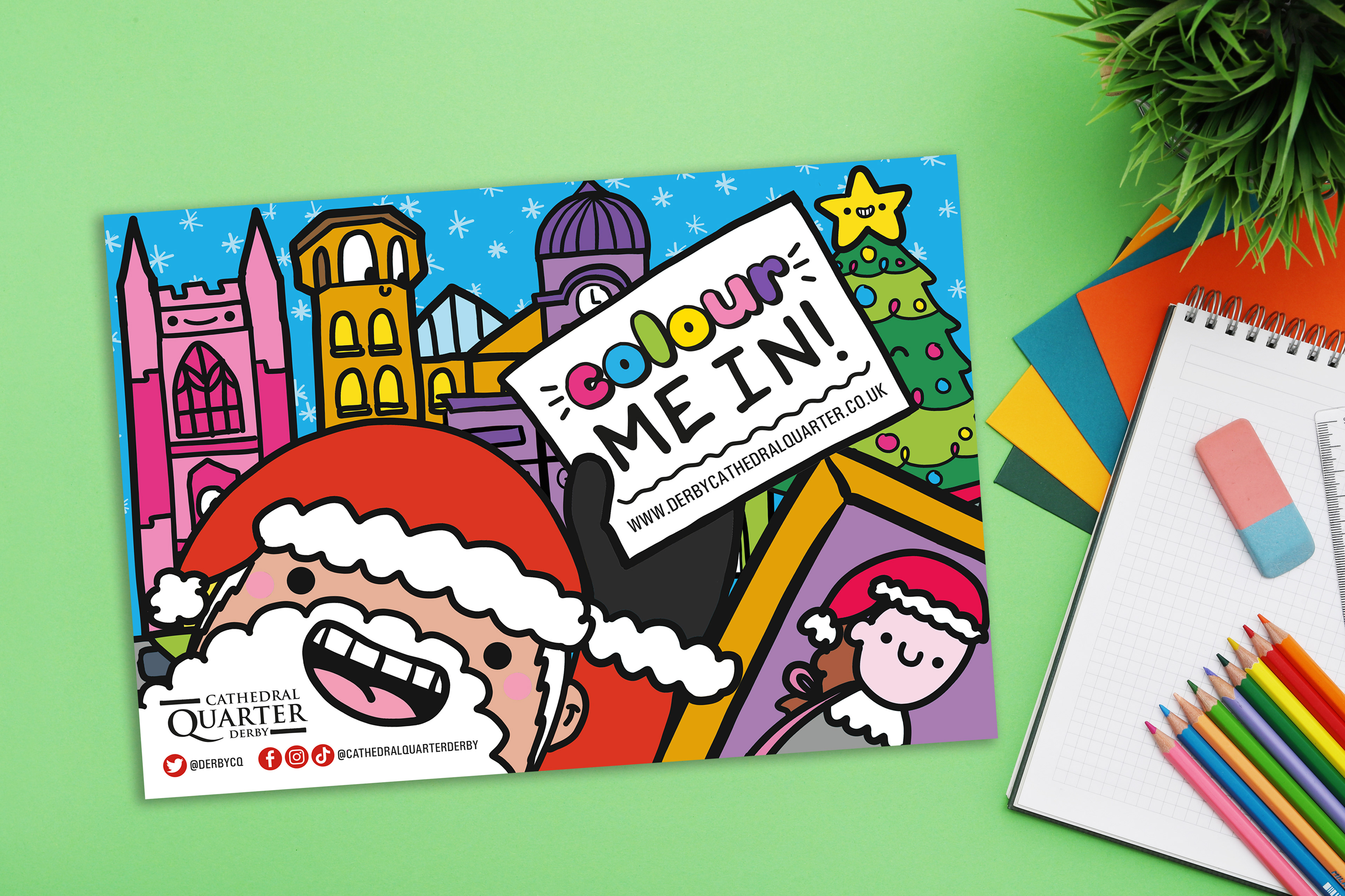 Christmas-themed colouring book design for the Cathedral Quarter Business Improvement District (BID) for the Santa's Grotto goody bag featuring well-known buildings and landmarks in Derby and my favourite Christmas cracker jokes!