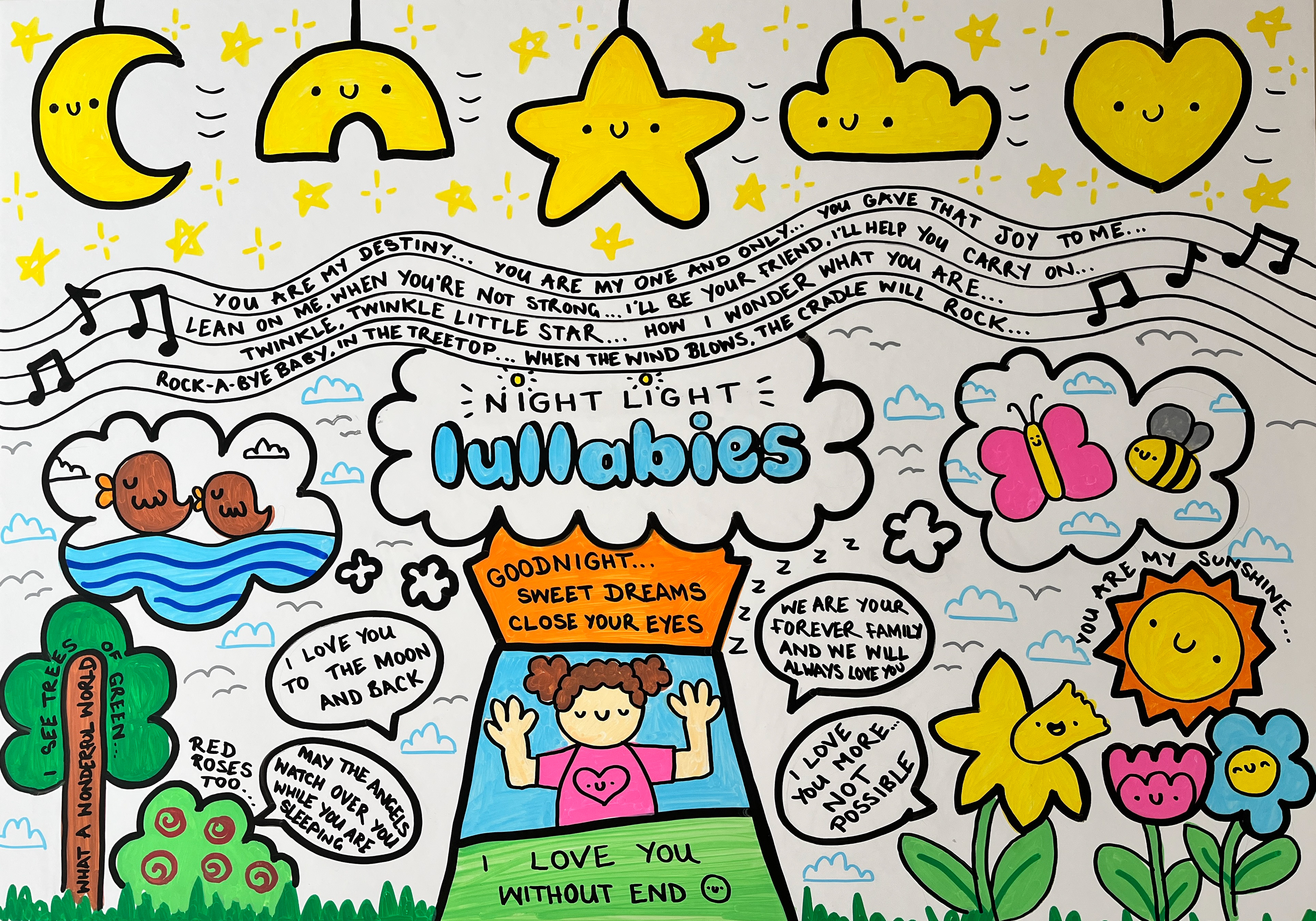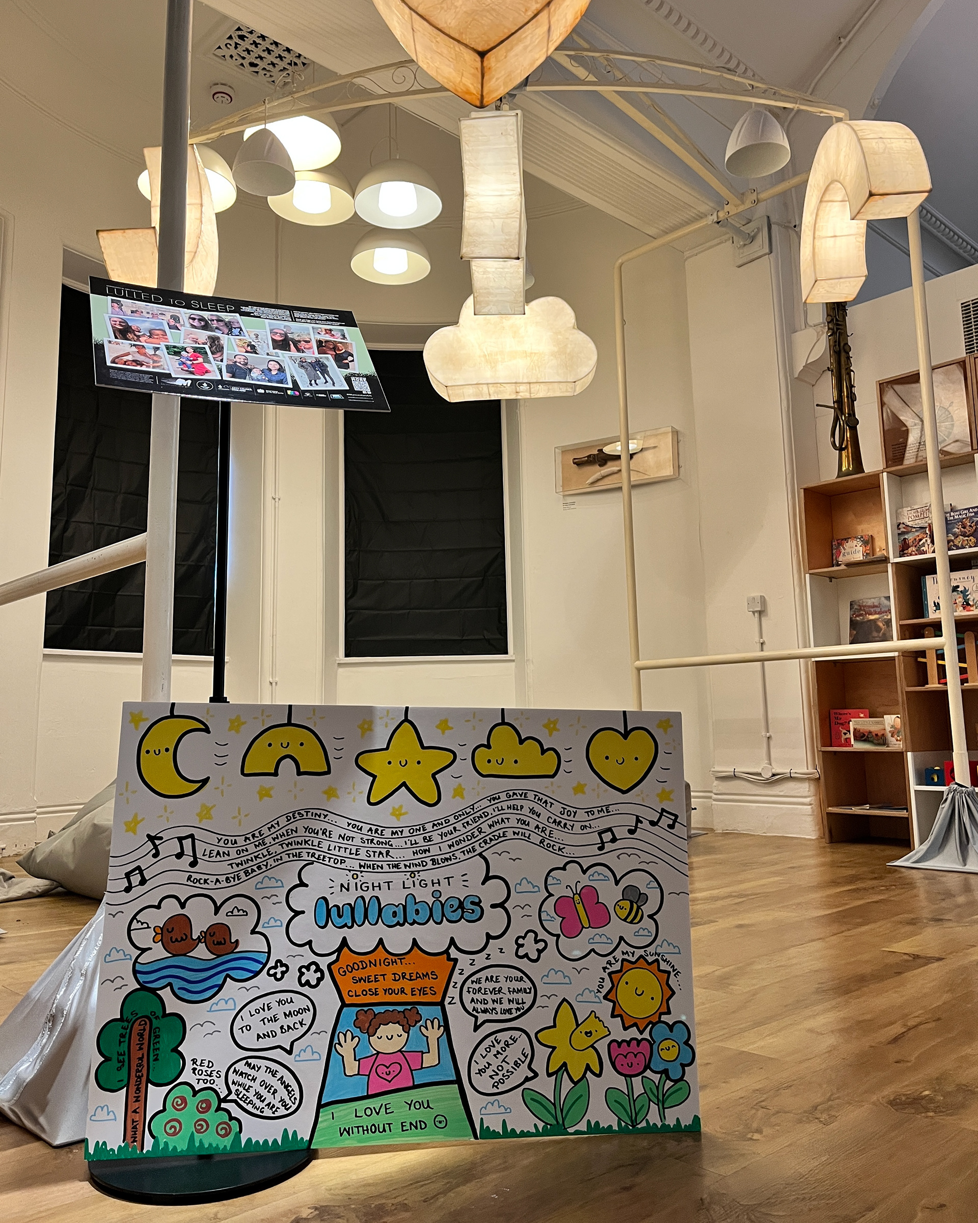 Live illustration work commissioned by Murmuration Arts, interpreting the Nightlight Lullabies exhibition at Derby Museums, focusing on the giant mobile that plays Derby parents’ bedtime wishes and lullabies.