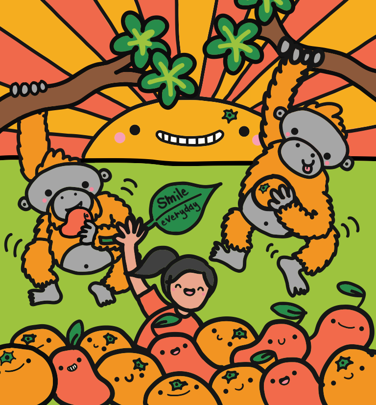 Sip into summer and let your taste buds enjoy the tropical tango of juicy mangoes and zesty oranges! Join the tree-top party with the swinging orangutans enjoying the cute fruits and having summer fun with Lesley So (Founder). Don't forget to 'smile every day'!